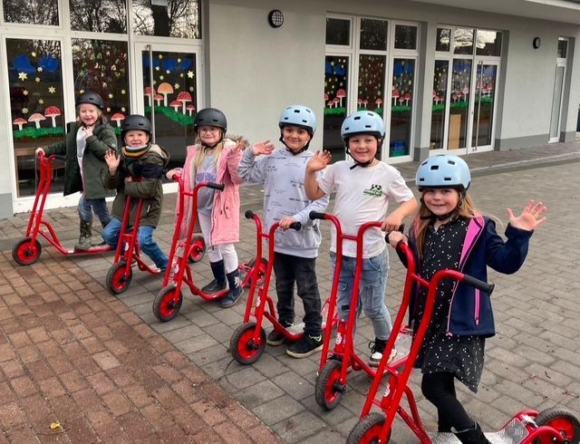 Der Förderverein spendet neue Helme für die Rollerfahrer in den Pausen