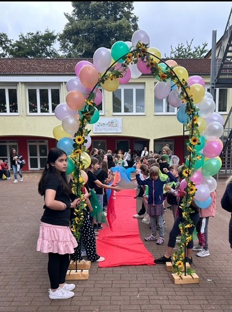 Heute Vormittag (05.07.2024) verabschiedeten wir uns von unseren ViertklässlerInnen, die nach den Sommerferien die weiterführende Schule besuchen werden. Nachdem Frau Stöcker die Kinder mit ihren Eltern begrüßte, erinnerten sich die ViertklässlerInnen an schöne kostbare Momente ihrer Grundschulzeit, die sie im Vorfeld im Unterricht reflektierten, aufschrieben und in ihrem Abschlussbuch sammelten. Mit der Tanzaufführung der Klasse 3a, den die Kinder mit der Tanzlehrerin Frau Müller einstudiert hatten, wurde das Programm abgeschlossen. Mit dem Gang auf dem roten Teppich, durch die Winkegasse der Kinder und anschließend durch den geschmückten Torbogen verabschiedeten die ViertklässlerInnen sich dann von allen Böckenheck-SchülerInnen. Zusätzlich verabschiedete sich die gesamte Schulgemeinde anschließend von Frau Schmaling, die nach vielen Jahren in den wohlverdienten Ruhestand geht.