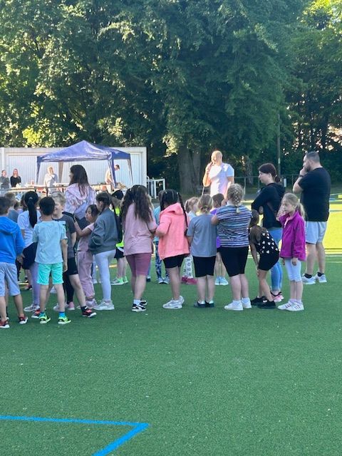 Am Montag (12.05.2025) fand das Sportfest statt. Aufgeregt gingen alle Kinder um 8.15 Uhr zum Sportplatz. Dort wurden alle Anwesenden herzlich von Herr Löffler begrüßt. Dann ging es mit einem gemeinsamen Aufwärmlied los. Anschließend starteten alle Gruppen an ihren Stationen. Dieses Jahr halfen uns Schüler*innen der Klasse 6 ( Sportklasse) der Realschule.
