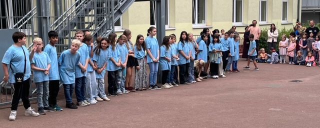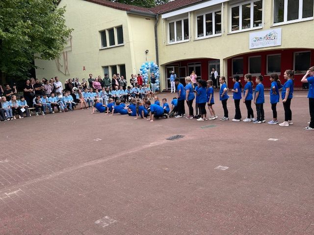 Im Anschluss versammelten sich alle Gäste auf dem Schulhof, wo die Kinder mit Reden, Liedern, Tänzen und kleinen Überraschungen verabschiedet wurden. Die Viertklässler haben ihre Spuren in unserer Schule hinterlassen- als Freunde, Mitschüler*innen und Persönlichkeiten, die wir nun mit einem lachenden und einem weinenden Auge ziehen lassen.
