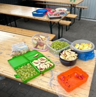 Überwältigt waren alle von den Obst- und Gemüsespenden. Der Stand war wirklich reichlich gefüllt und auch noch einen Tag später haben alle Kinder davon in der Frühstückspause gesund genascht.