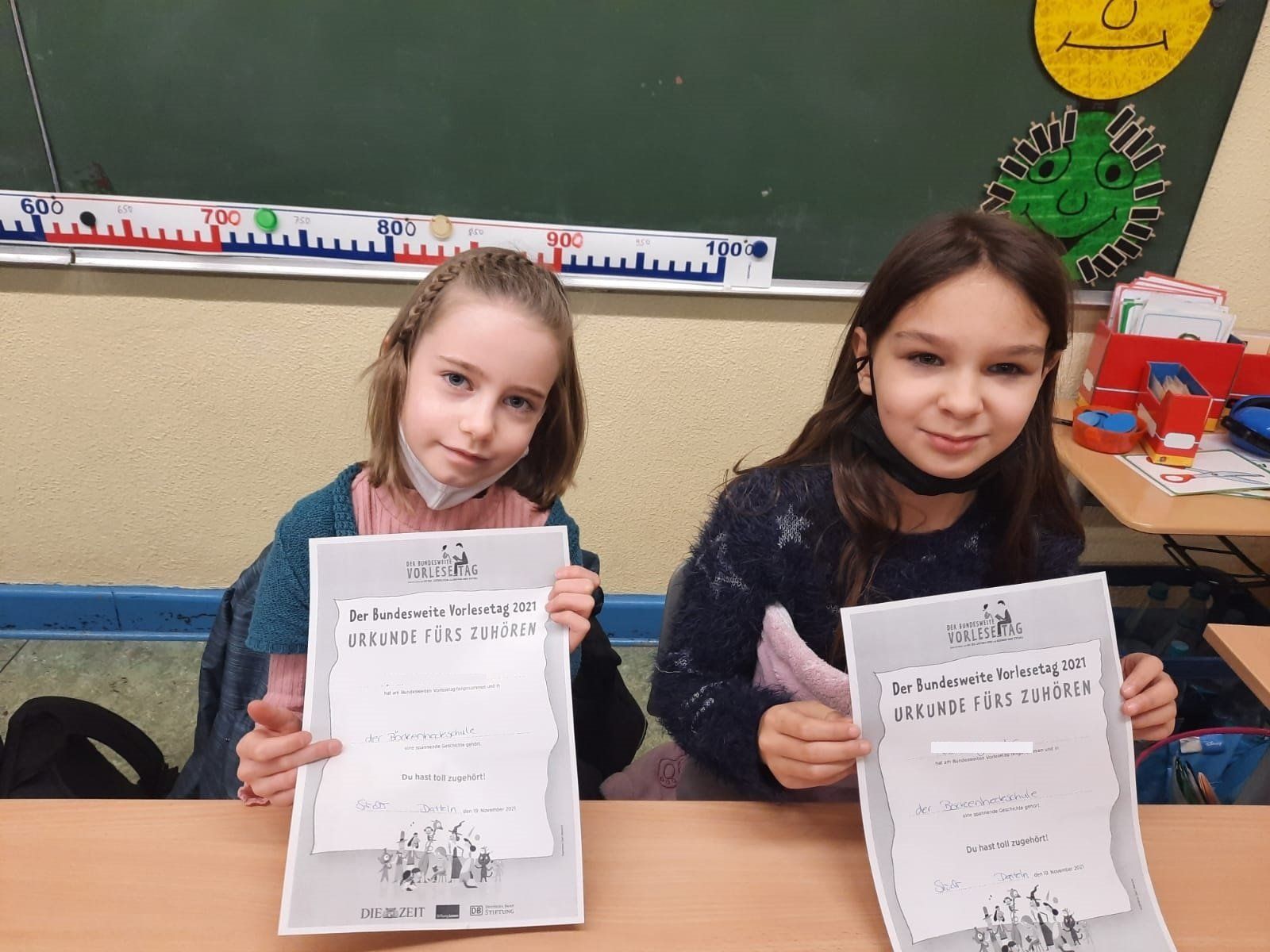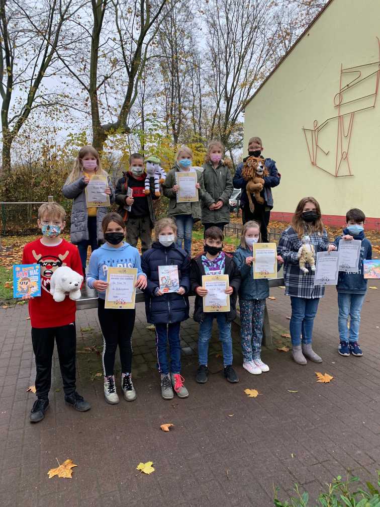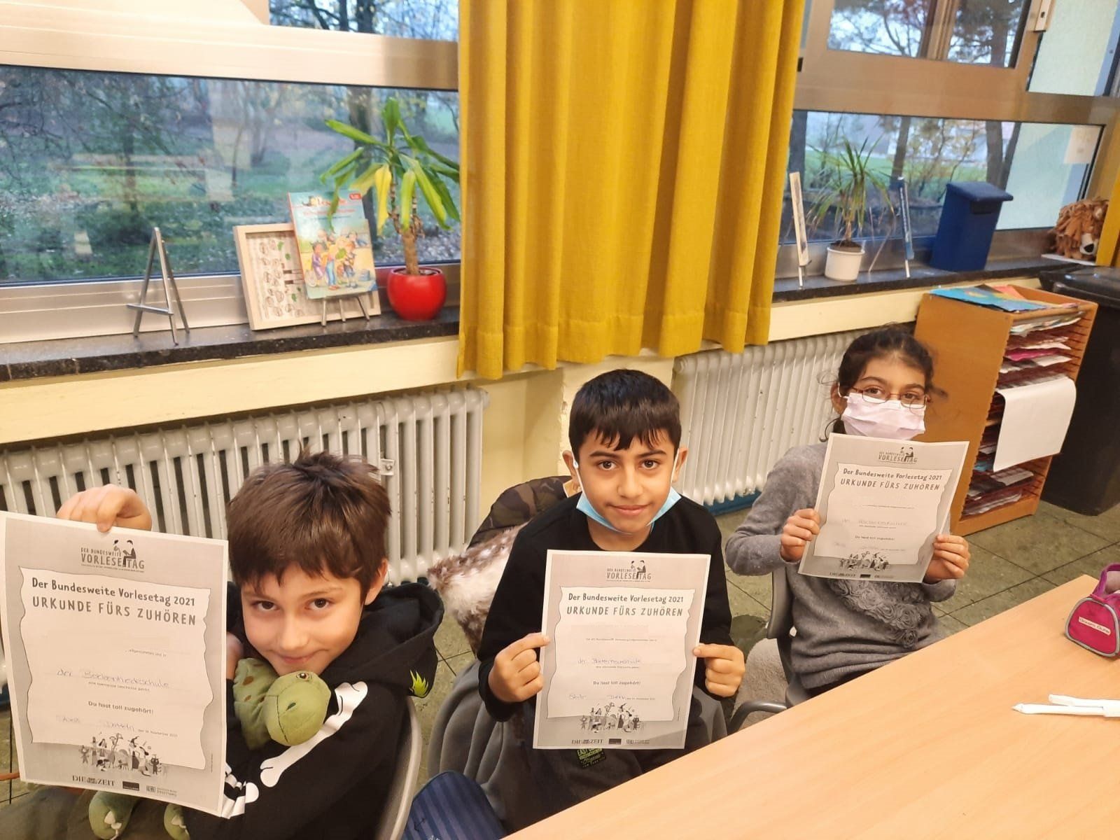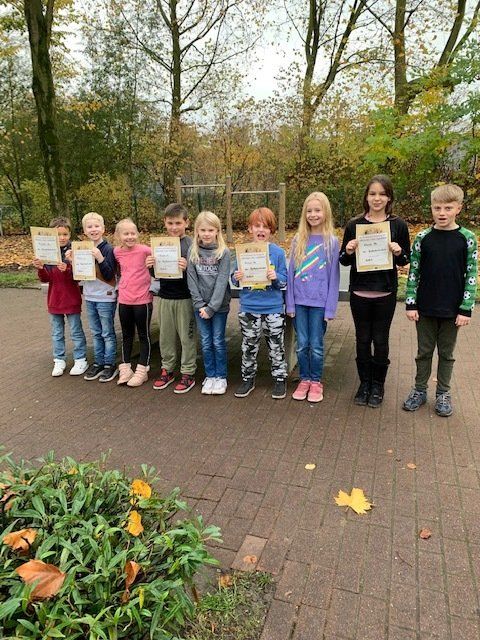 Hier sind alle Klassensprecher der Schule mit ihren Klassenurkunden. Sie haben sich Einstimmig für eine Wiederholung des Vorlesetages im nächsten Jahr ausgesprochen.