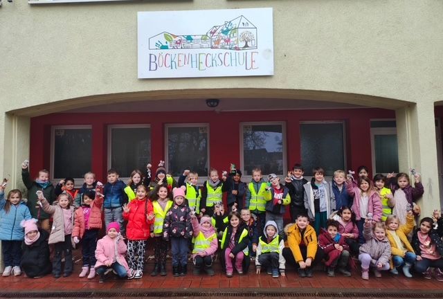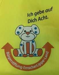 Die Warnwesten sollen die Kinder in der dunkleren Jahreszeit schützen, denn damit werden sie viel besser im Straßenverkehr gesehen. Das Maskottchen Bella, der Bürgerstiftung Emscher-Lippe Land, das auf den Westen auch zu finden ist, wurde natürlich gleich bewundert. Stolz präsentieren sie sich hier auf dem Schulhof.