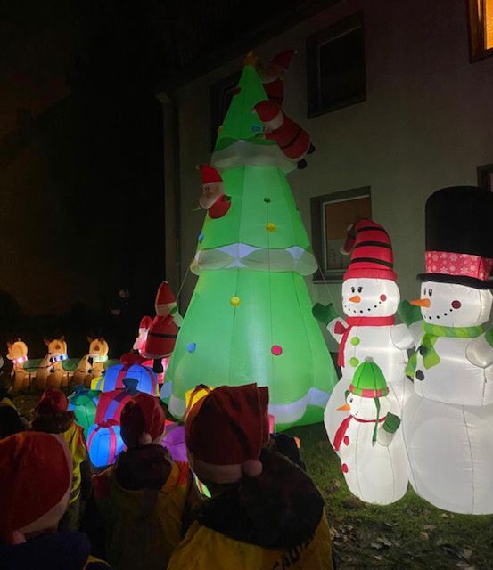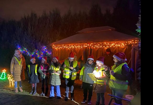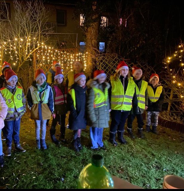 Am 21. Dezember trafen sich die Kinder und Eltern der beiden vierten Klassen um 17 Uhr auf dem Schulhof zu einer abendlichen Winter-Weihnachtswanderung. Zunächst stimmten sich alle ein mit dem Lied „Tragt in die Welt nun ein Licht“, das auch szenisch mit bunten Teelichtern begleitet wurde. Danach ging es los: Vier Familien hatten die Kinder eingeladen, ihre liebevoll weihnachtlich-winterlich dekorierten Gärten zu besuchen und zu bestaunen. Dazu wurden alle in jedem Garten mit warmen Getränken und weihnachtlichen Leckereien versorgt. Die Viertklässler:innen bedankten sich dafür mit verschiedenen Darbietungen: Weihnachtliche Lieder, Gedichte und Texte wurden vorgetragen und machten so die stimmungsvolle Atmosphäre perfekt. Auch an dieser Stelle nochmals ein besonders herzliches Dankeschön an die Familien, die uns dieses Erlebnis ermöglicht haben!