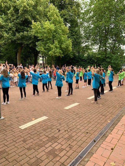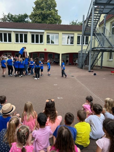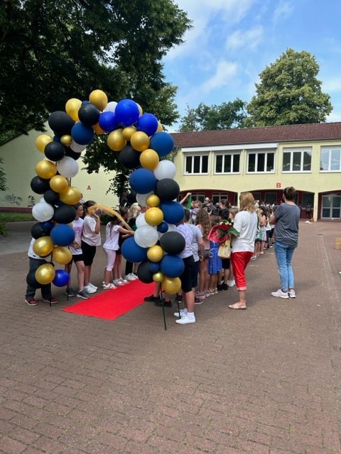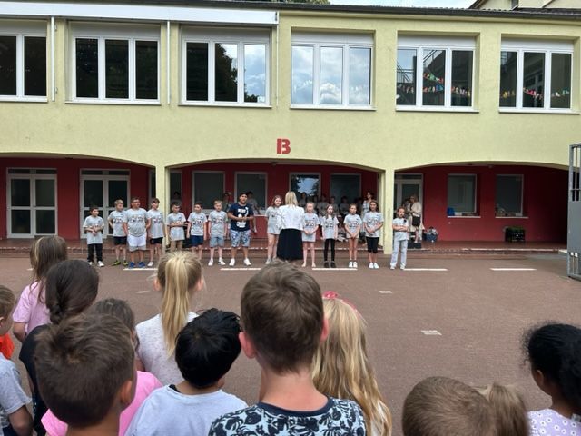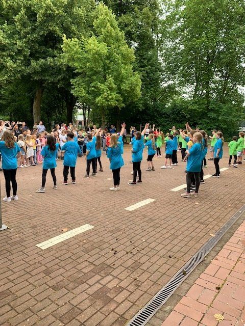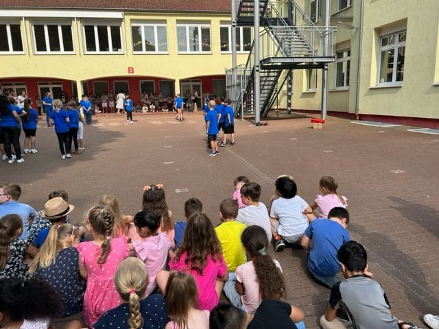 Am 24.06.2022 war es soweit. Die Klassen 4a und 4b wurden auf dem Schulhof feierlich von allen SchülerInnen, LehrerInnen und Eltern verabschiedet. Zum Abschied führen die Viertklässler einen eingeübten Tanz vor.