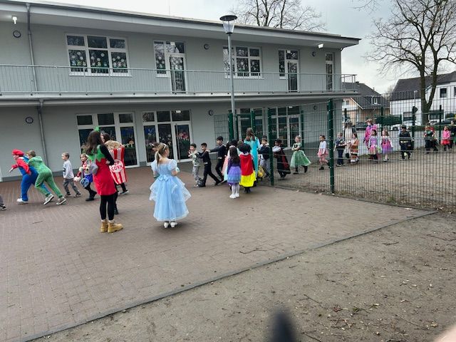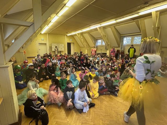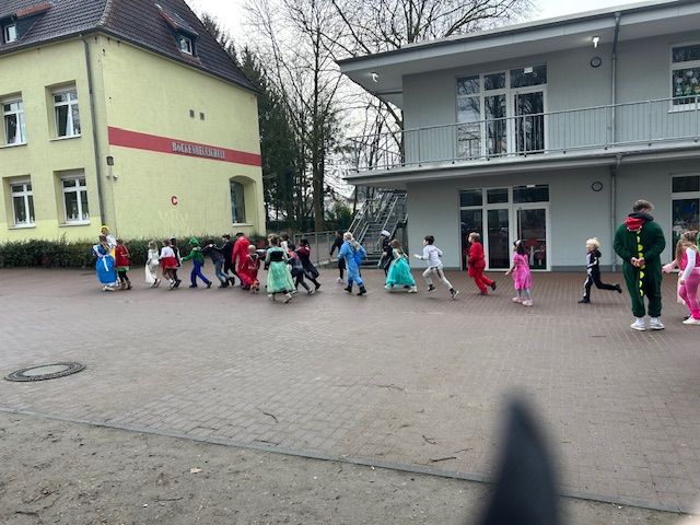 Am 28.2. feierten alle Kinder in den Klassen Karneval. Im Anschluss trafen sich alle Klassen in der Aula und dort bekamen die Kinder eine Tanzdarbietung geboten. Anschließend gab es eine große Polonaise durch das Schulhaus und über den Schulhof.