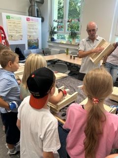 Gebannt lauschten die Kinder in der Klasse 2a. Frau Rosenfeld ist Imkerin, erklärte der Klasse sehr anschaulich das Leben der Bienen und zeigte die Schritte der Honigernte. Die Klasse hatte zuvor im Unterricht das Thema Bienen behandelt und der Besuch bildete den Abschluss der Reihe. Die Kinder erfuhren eine Menge über den Beruf des Imkers und das Leben eines Bienenvolkes. Frau Rosenfeld hatte eine Menge Anschauungsmaterial und Imkerwerkzeug mitgebracht. Die Klasse 2a war sehr begeistert von dem Thema. So entstand der Wunsch nach einer Blumenwiese für Wildbienen im Schulgarten und den Bau von Insektenhotels. Der Förderverein hatte uns bei diesem Projekt unterstützt.Wir sagen: Danke schön.