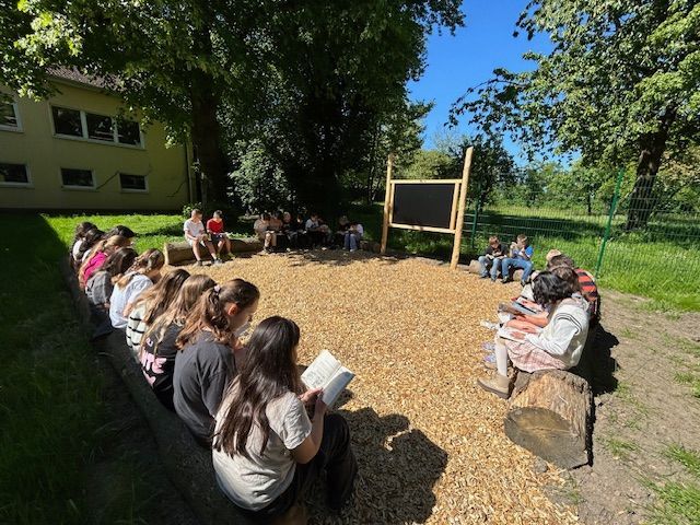 Am Dienstag (13.5.2025) war es soweit. Die Zebraklasse 4a nutzte das schöne Wetter um ihre Lesestunde nach draußen zu verlegen. Da sie gerade das Welttagsbuch: ,,Cool wie Bolle" im Unterricht lesen und besprechen, bot sich hier die Gelegenheit, die neuen Sitzgelegenheiten einmal auszuprobieren.