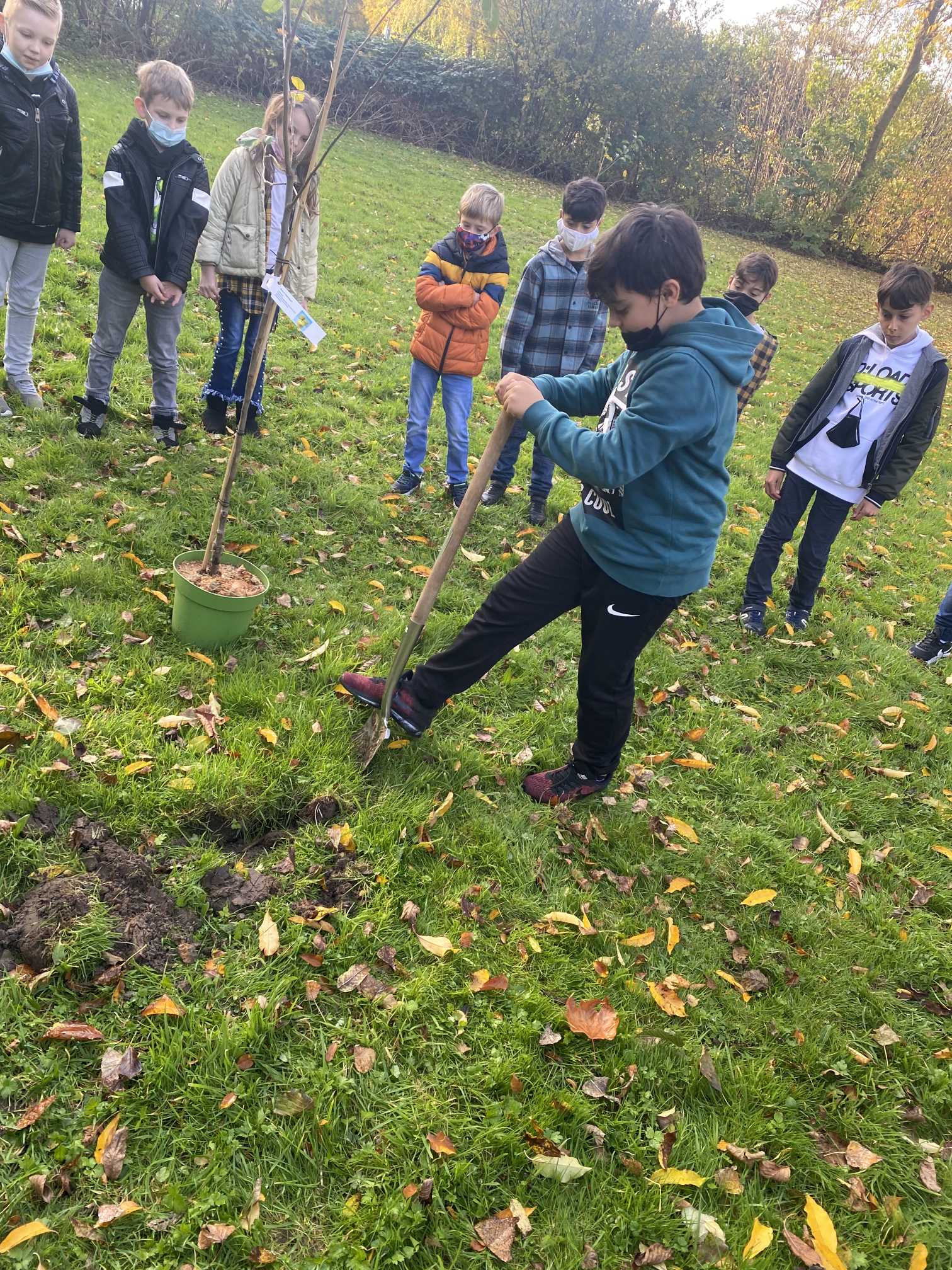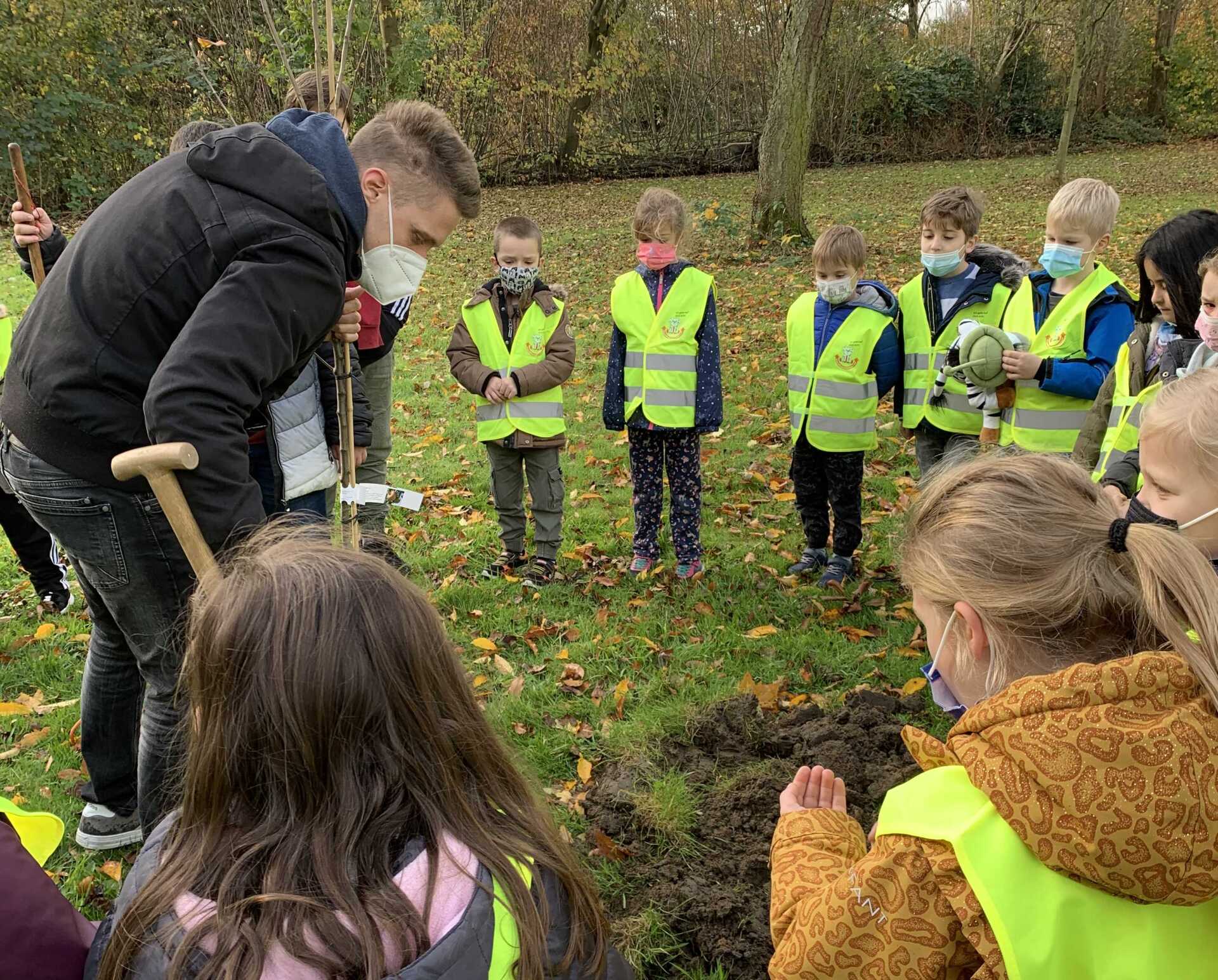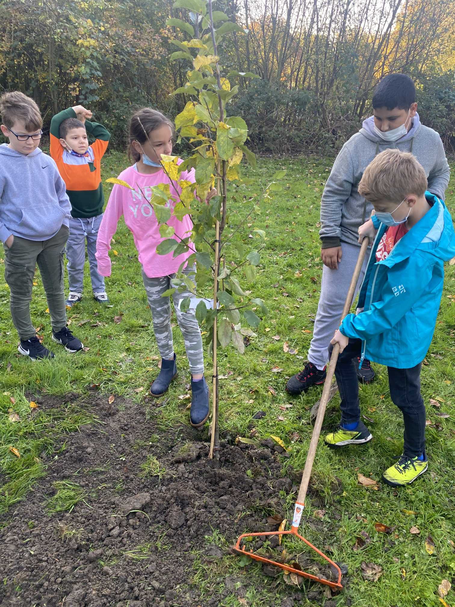 Nach dem Foto mit den Warnwesten ging es gleich weiter für die Kinder der Klasse 1a. Gemeinsam mit Herrn Paschvoß und Frau Porwol pflanzten sie den Apfelbaum für die Klassen 1 und 2 ein. Die Klasse 4b (Frau Rusche) hatte ihr Bäumchen auch schon gepflanzt und wir konnten dabei zusehen.