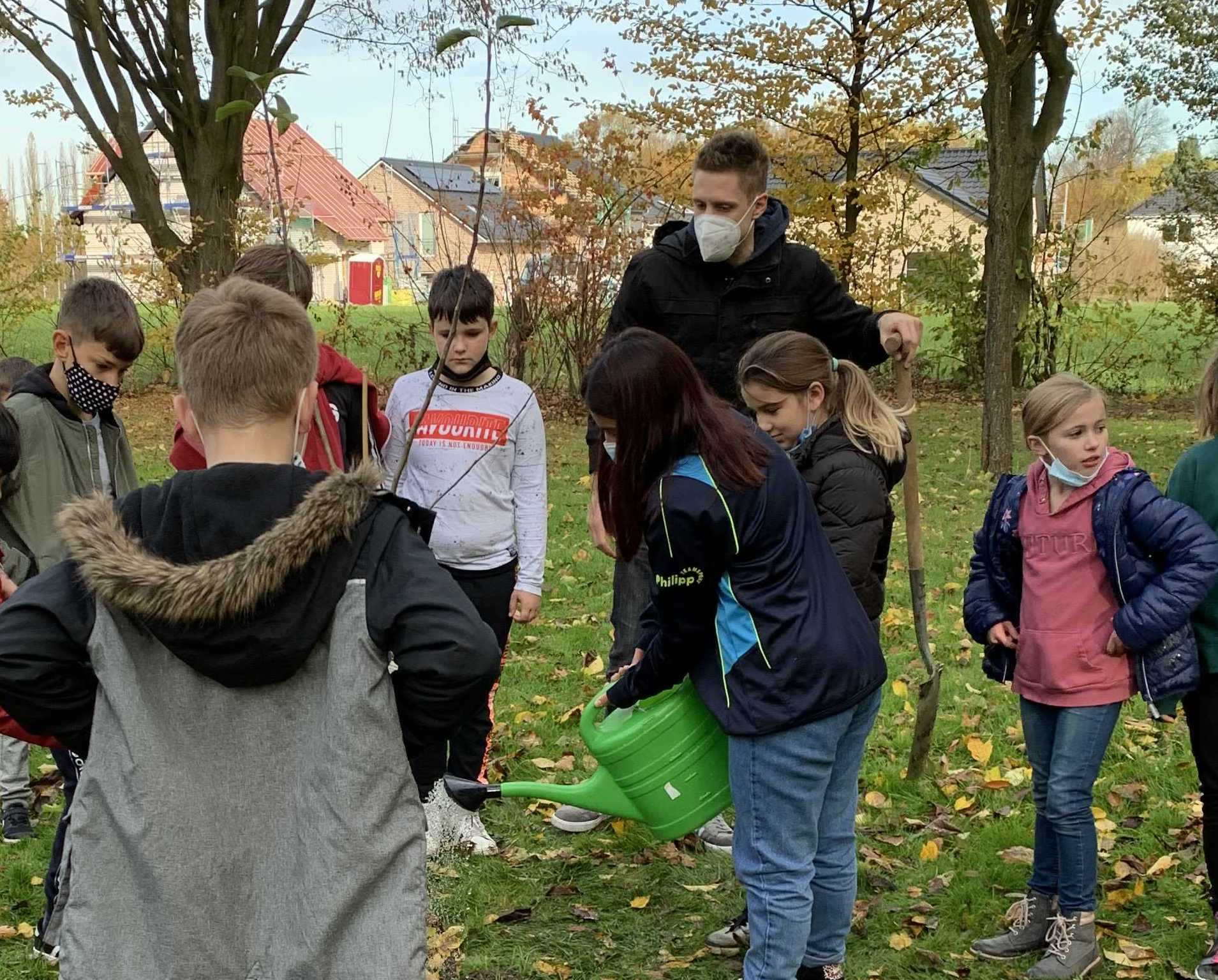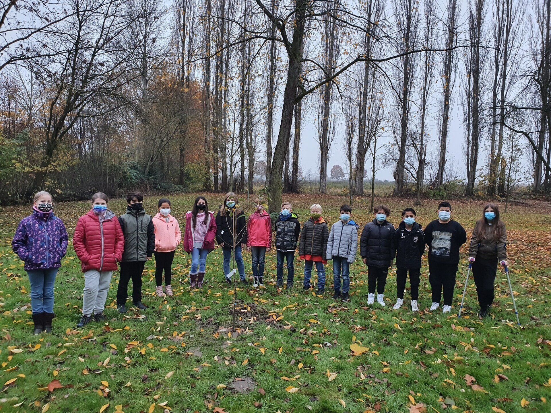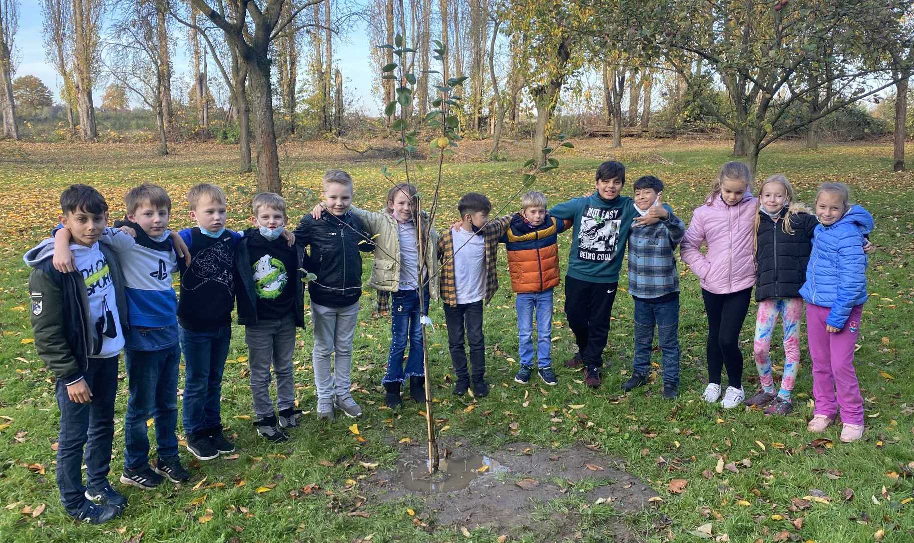 Nach dem Foto mit den Warnwesten ging es gleich weiter für die Kinder der Klasse 1a. Gemeinsam mit Herrn Paschvoß und Frau Porwol pflanzten sie den Apfelbaum für die Klassen 1 und 2 ein. Die Klasse 4b (Frau Rusche) hatte ihr Bäumchen auch schon gepflanzt und wir konnten dabei zusehen.