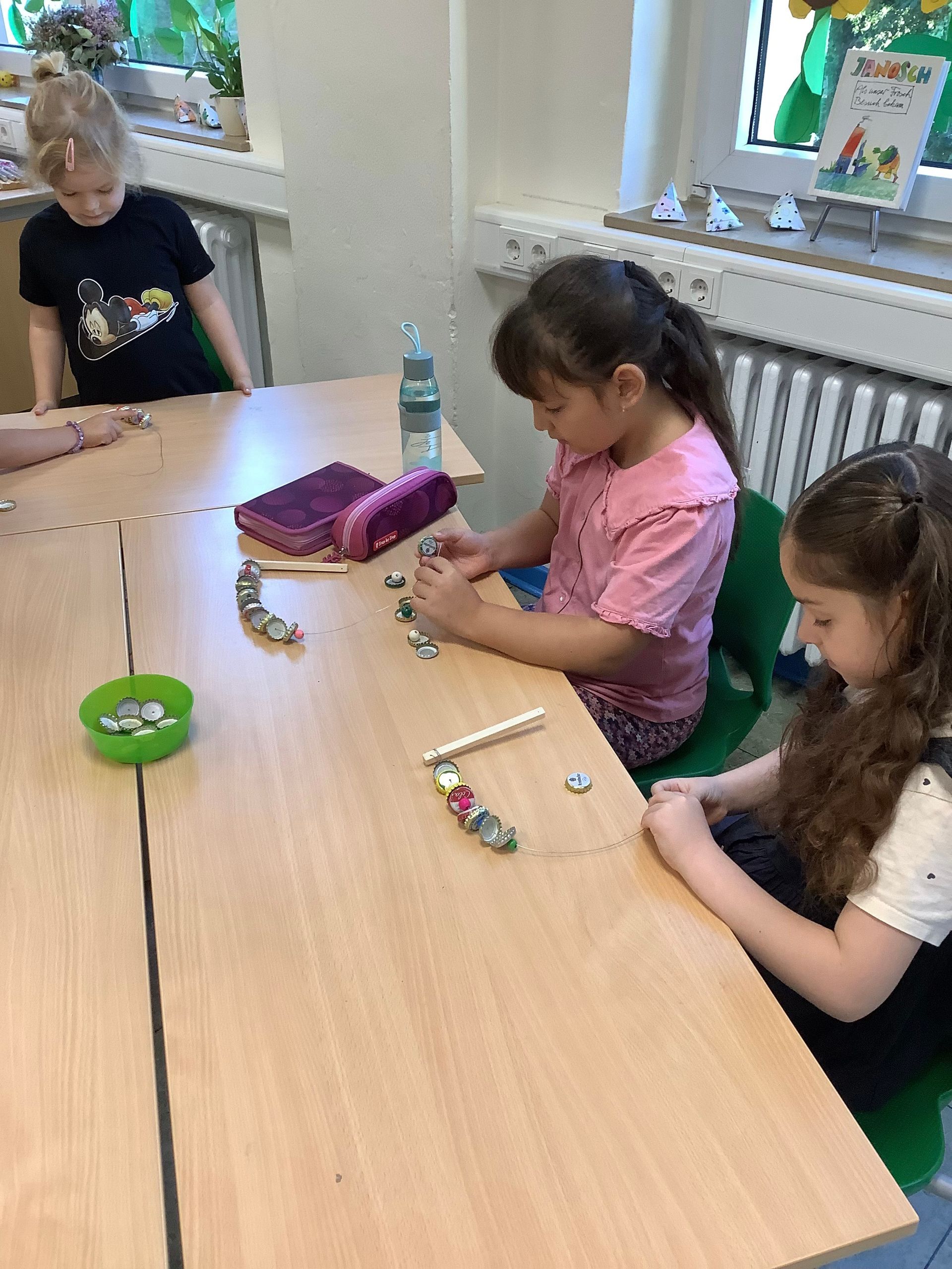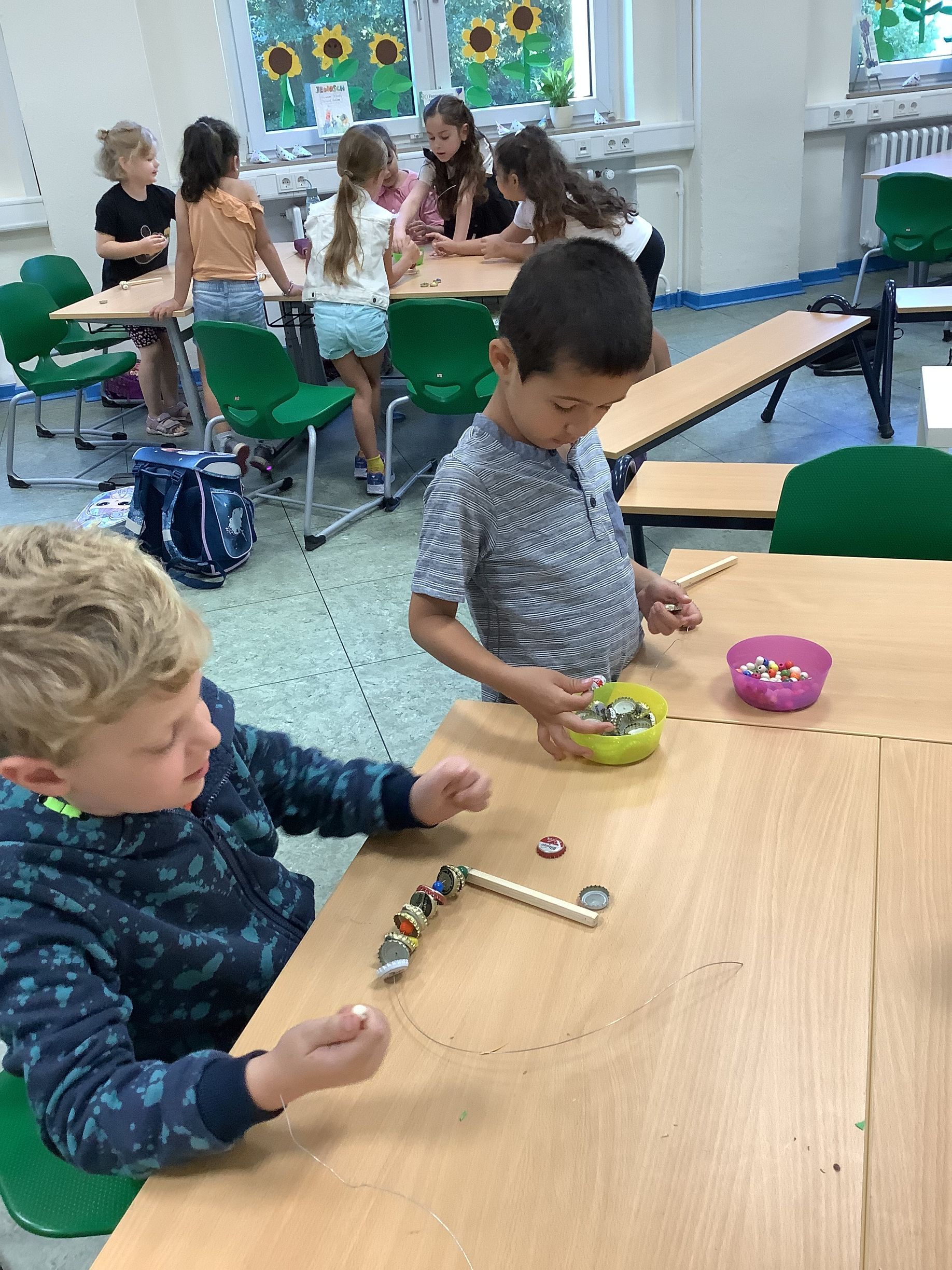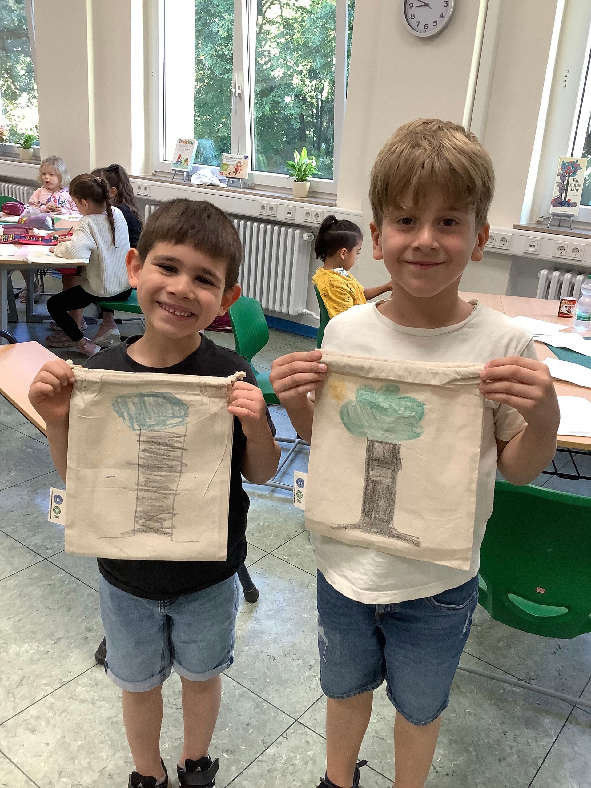 Die Kinder der Klasse 1b informierten sich zum Thema Mülltrennung, Recycling und Upcycling. Aus Kronkorken und Toilettenpapierrollen wurden Instrumente wie Schellenkränze und Rasseln hergestellt. Um weniger Plastik zu verbrauchen, bemalten die Schülerinnen und Schüler Stoffbeutel.