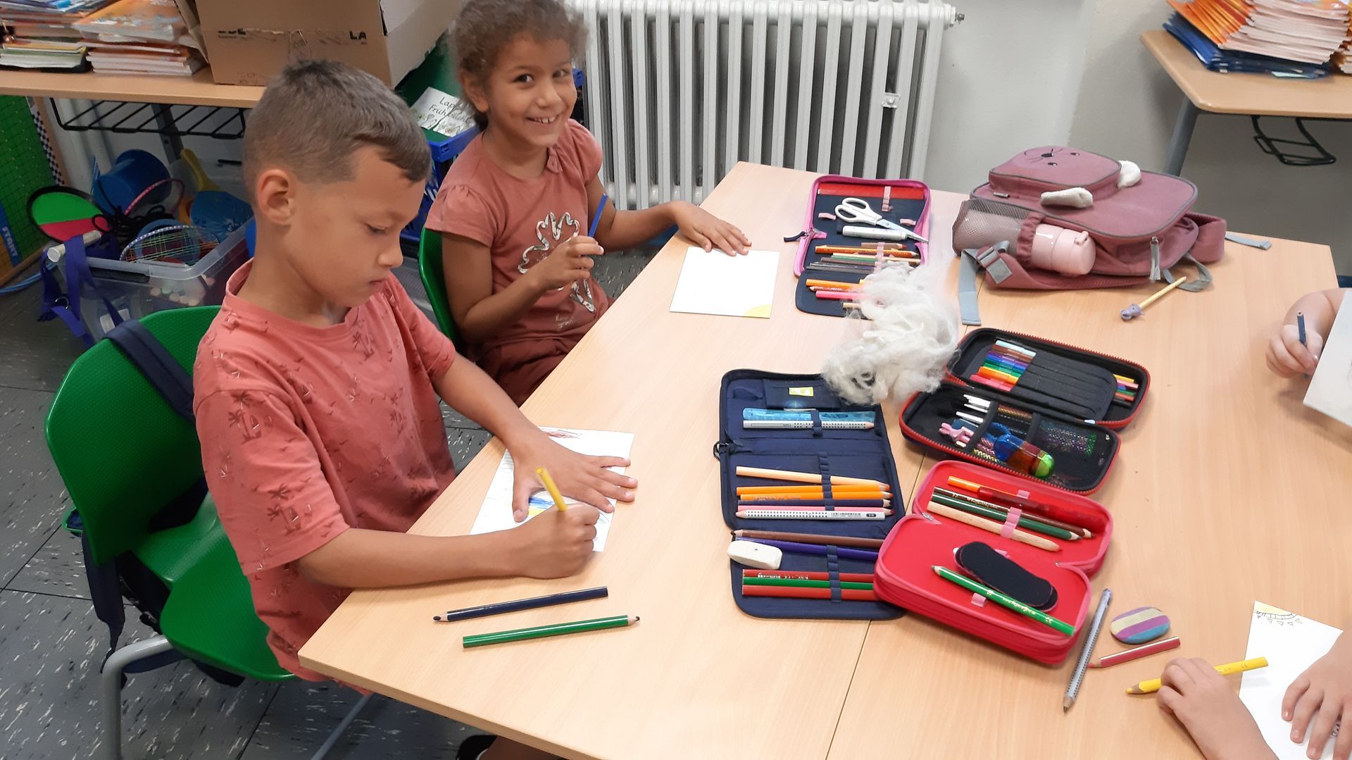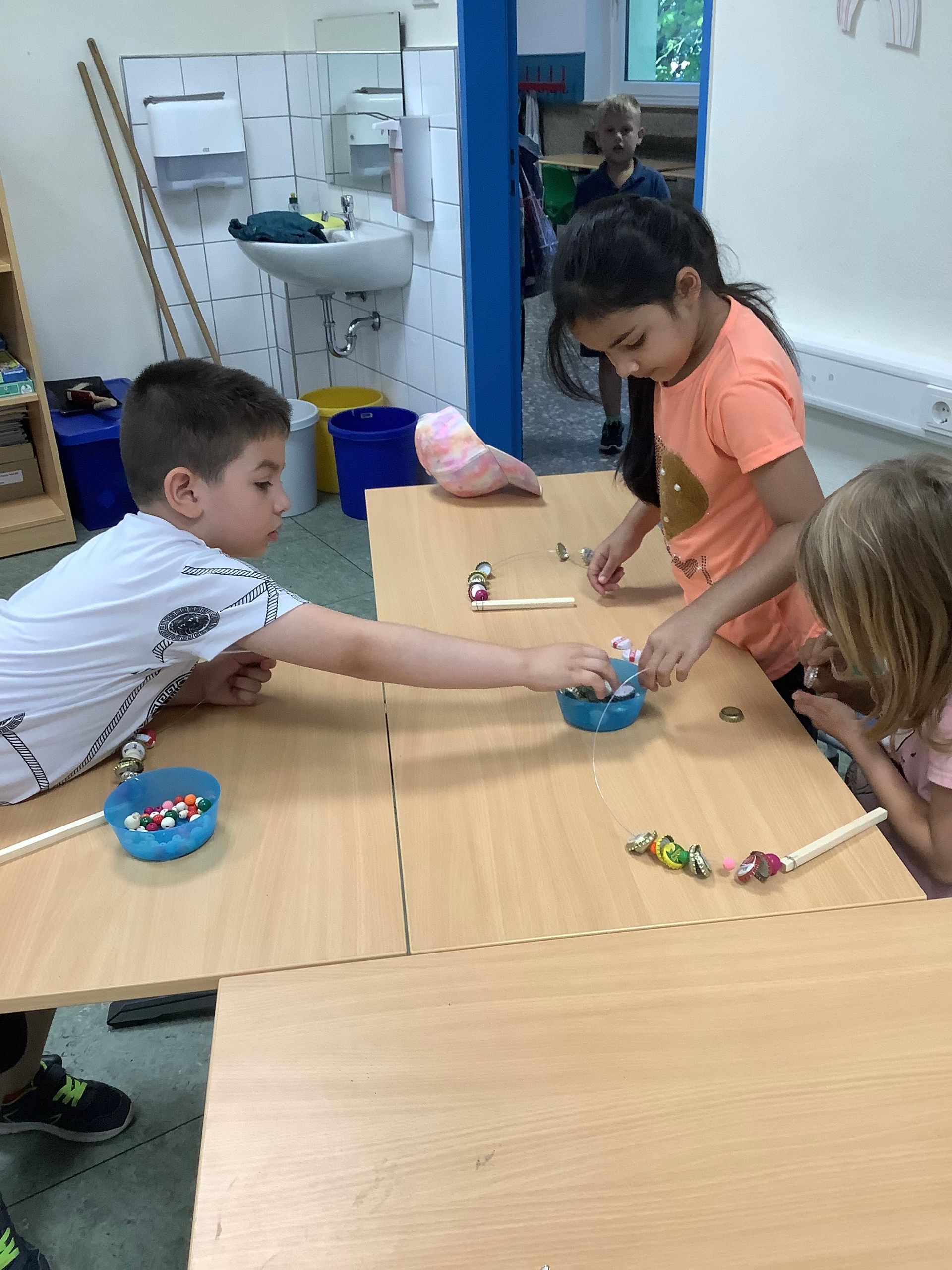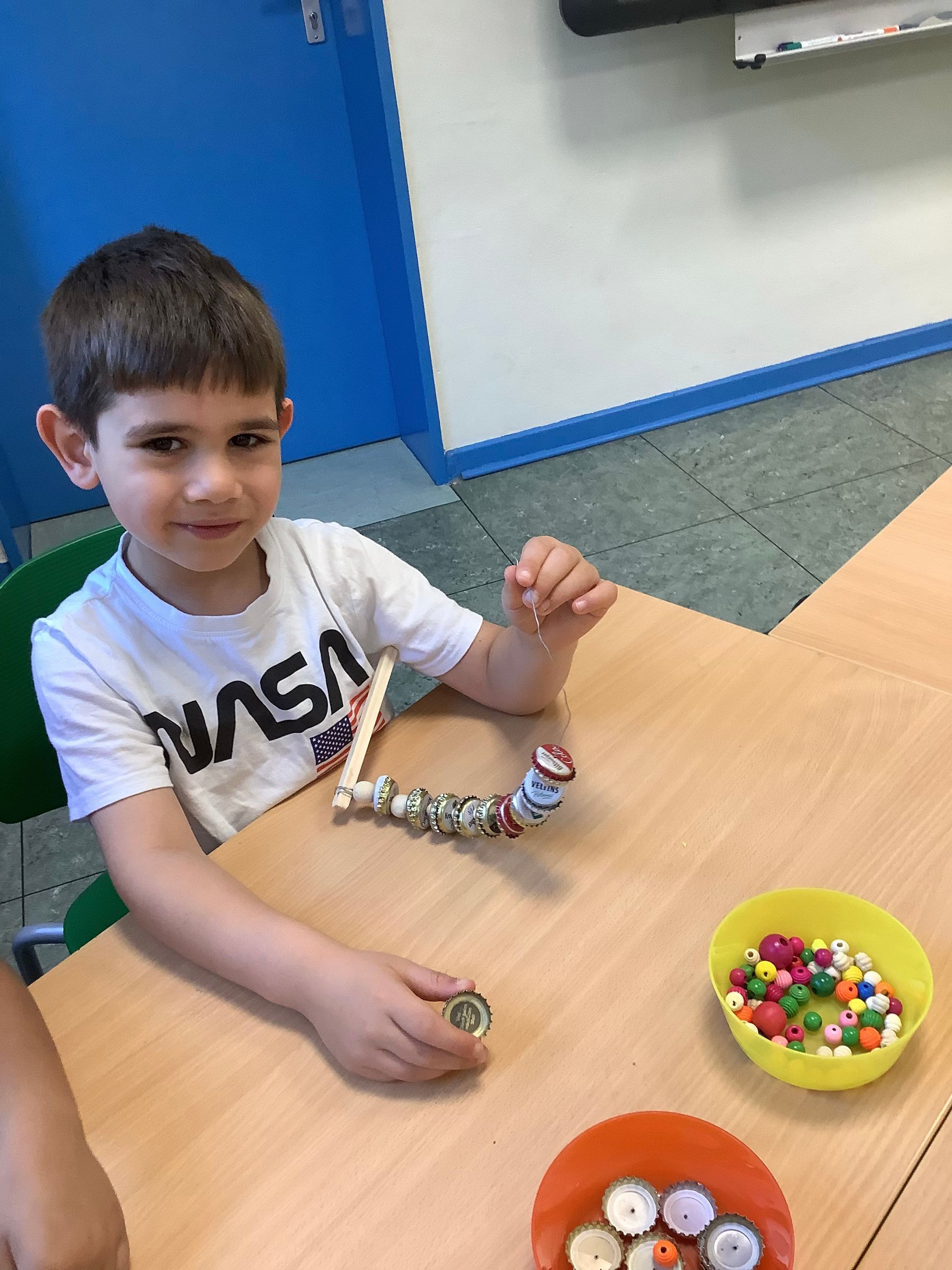 Die Kinder der Klasse 1b informierten sich zum Thema Mülltrennung, Recycling und Upcycling. Aus Kronkorken und Toilettenpapierrollen wurden Instrumente wie Schellenkränze und Rasseln hergestellt. Um weniger Plastik zu verbrauchen, bemalten die Schülerinnen und Schüler Stoffbeutel.