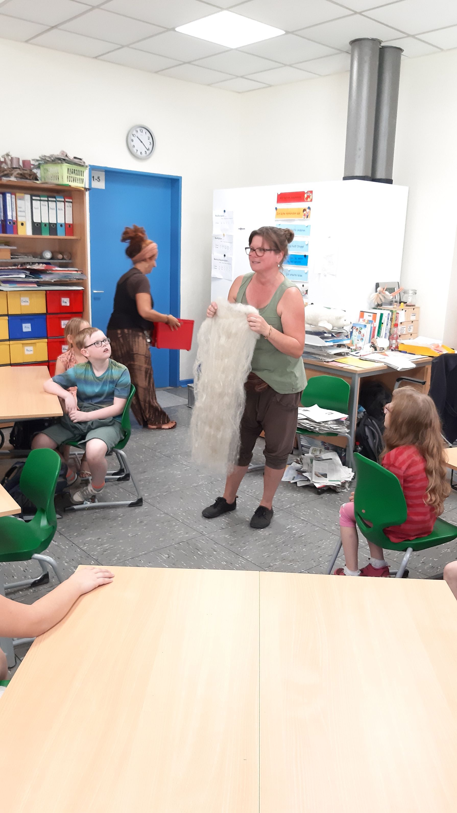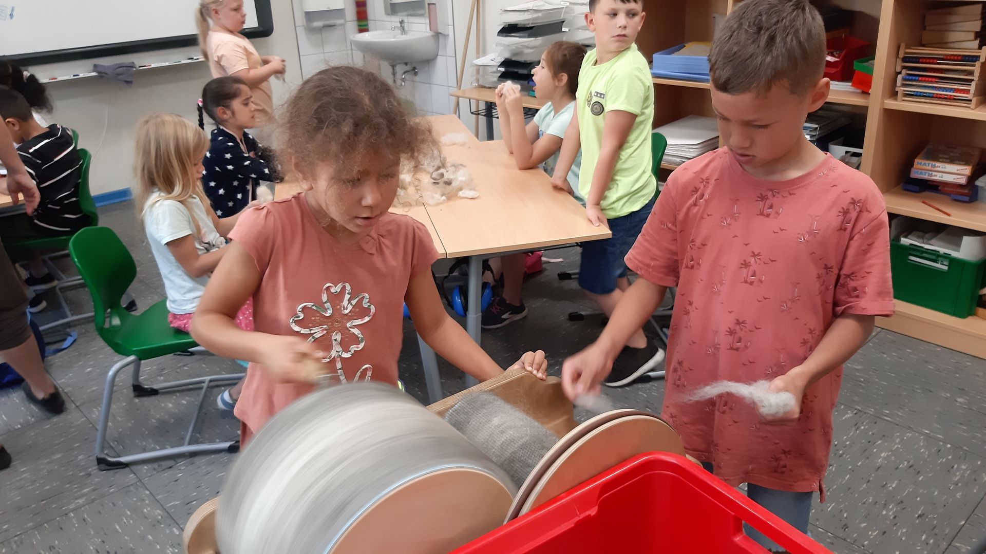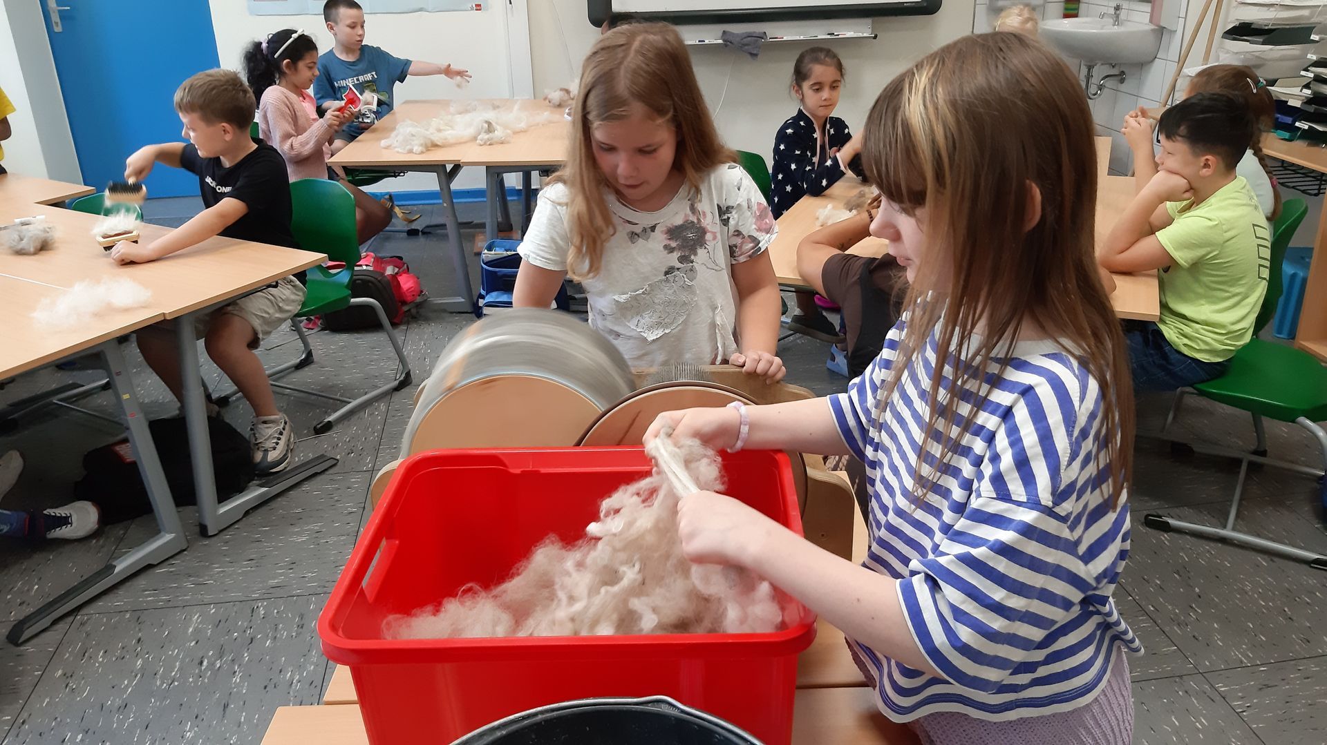 In der Projektwoche zum Thema Nachhaltigkeit hat sich die Klasse 2a mit den Zielen für Nachhaltige Entwicklung der UN, mit Streuobstwiesen, Papierschöpfen und dem Thema Wolle beschäftigt. An einem der Tage hatten wir Besuch von Mitarbeiterinnen vom Hof Wessels in Herten. Die Kinder durften Wolle reinigen, bürsten, durch eine Walze drehen und anschließend mit den Händen zu einem Faden drehen. Alle Ergebnisse wurden zu einer langen Schnecke zusammengelegt für die Präsentation am Tag der offenen Tür. Es hat allen sehr viel Spaß gemacht!