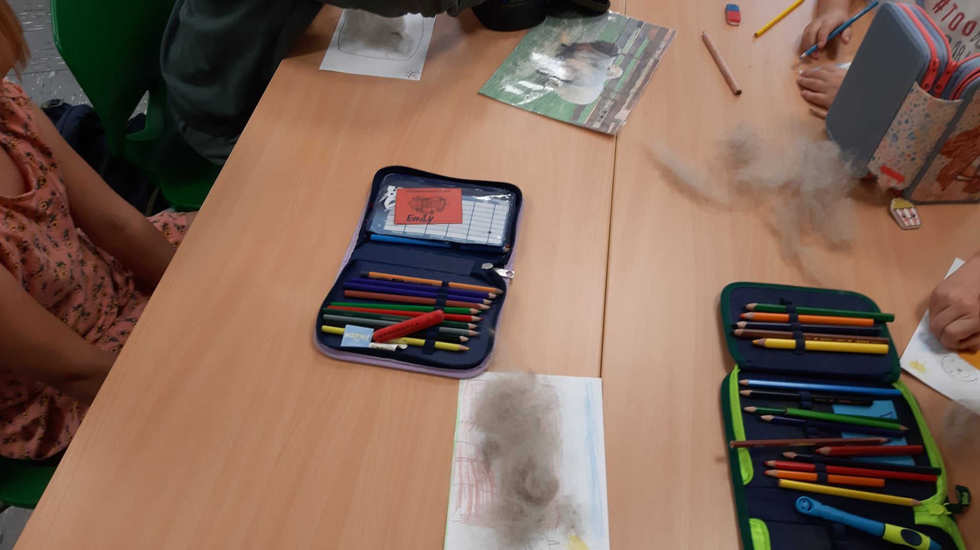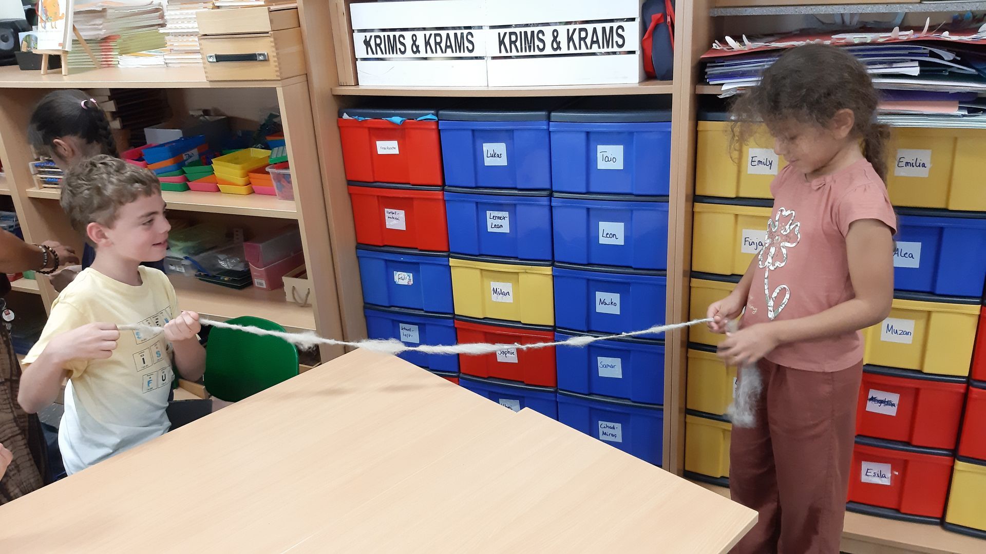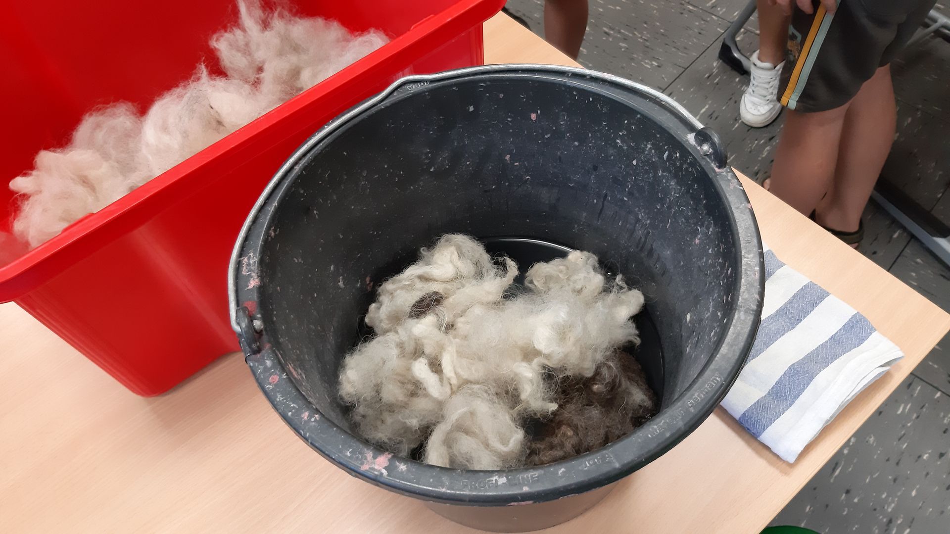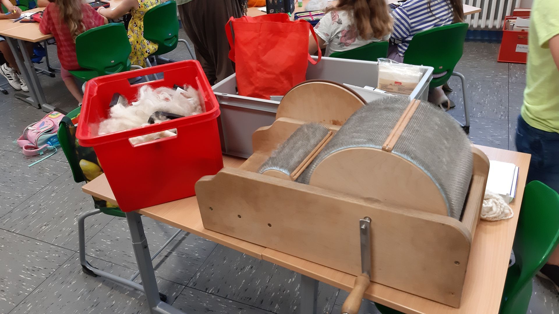 In der Projektwoche zum Thema Nachhaltigkeit hat sich die Klasse 2a mit den Zielen für Nachhaltige Entwicklung der UN, mit Streuobstwiesen, Papierschöpfen und dem Thema Wolle beschäftigt. An einem der Tage hatten wir Besuch von Mitarbeiterinnen vom Hof Wessels in Herten. Die Kinder durften Wolle reinigen, bürsten, durch eine Walze drehen und anschließend mit den Händen zu einem Faden drehen. Alle Ergebnisse wurden zu einer langen Schnecke zusammengelegt für die Präsentation am Tag der offenen Tür. Es hat allen sehr viel Spaß gemacht!