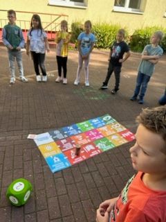 Auf dem Schulhof konnten die Kinder die 17 Ziele mit einem Spiel erforschen und lernen, um was es da eigentlich geht.